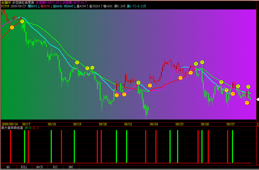 2.如顯示笑臉後 (多空線)與(多空線a) 在次出現向上翻紅時就不要在出現笑臉, 一直保持到 ( 多空線)與(多空線a) 向下翻綠時再顯示哭臉于K棒上方.