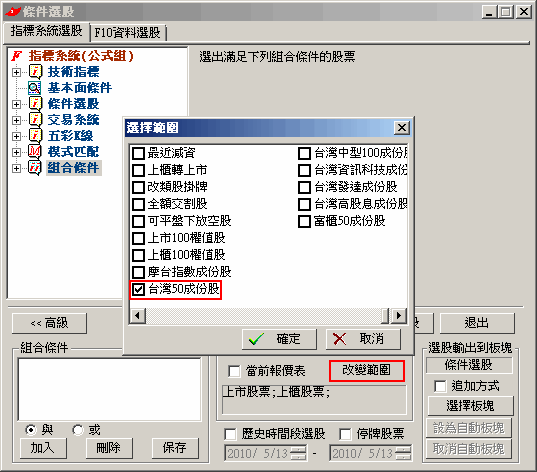 引用:最初由 victor0726 發表 總版主您好: 我的條件選股中,只想選出台灣50成份股內有符合條件的再選出來,其它非台灣50的股票符合條件不選出來,該怎麼做呢? 謝謝您的解答 可以利用條件選股裡面的改變範圍唷