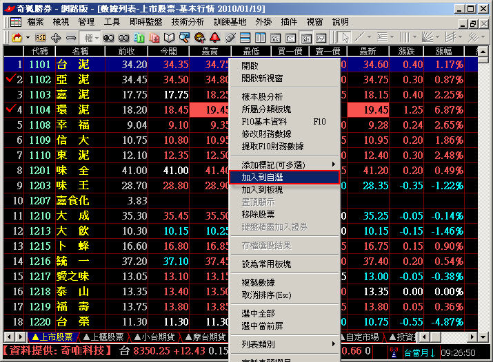 引用:最初由 trtc516 發表 請教版主大大.................... 數據列表有"上市股票" 如何將"上市股票+上櫃股票" 感謝.................... 可以將上市股票跟上櫃股票加到"自選股"裡面變成一個板塊唷! 加入到自選的方法 對要加入自選的股票點滑鼠右鍵→加入到自選 (可用Shift複選多個要加入的商品)