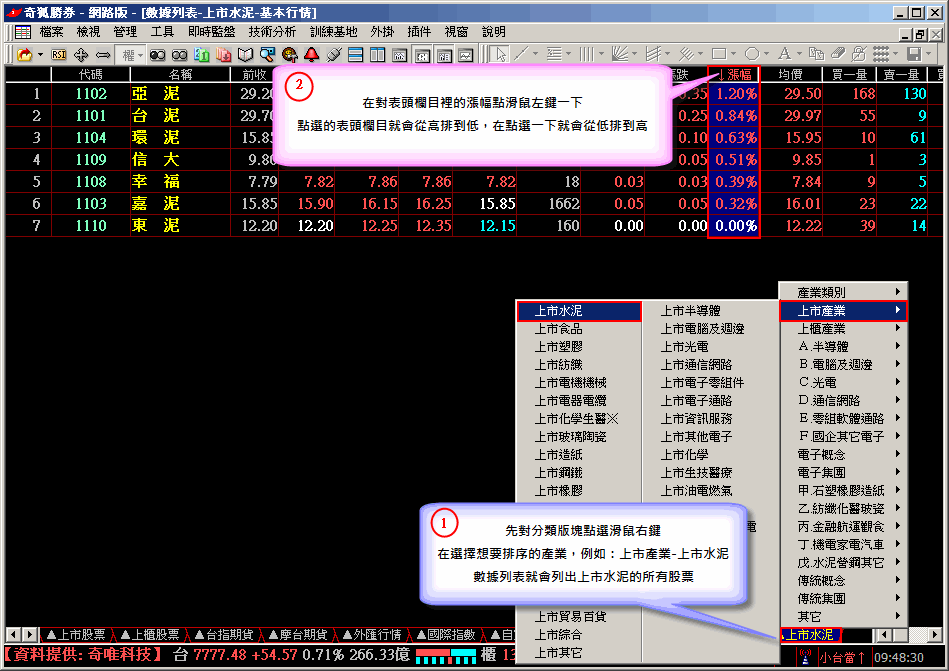 引用:最初由 moutain 發表 請問可以用奇狐系統 的選股功能 找出各類股中 漲幅最大的領頭羊嗎?? 謝謝~~ 其實可以用簡單的排序去找出各類股中漲幅最大的股票。