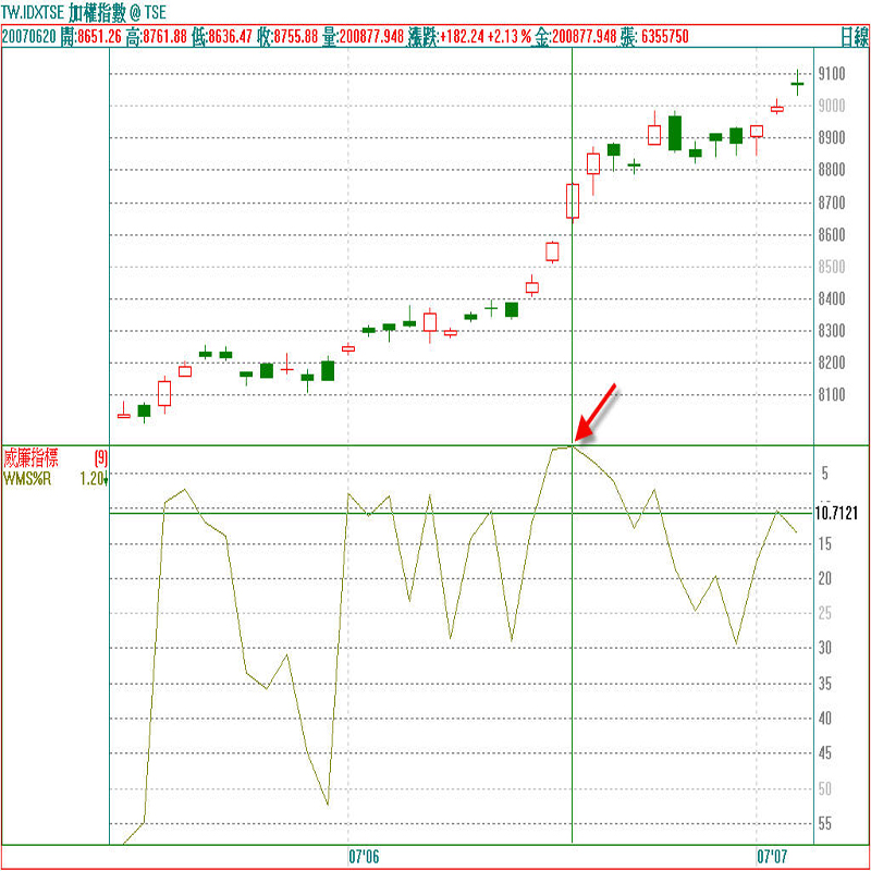 引用:最初由 hahaez 發表 我想請教副圖區間值問題,以威廉指標為例,0最大,100最小, 如果值為0,線圖連到最上方,,100連到最下方,現在問題來了,我如果把k線圖放大到10根,10根裡假如30最大,90最小,我希望副圖裡顯示出來的是30緊貼連到最上方,90連到最下方,這個部份軟體可以設定嗎?。 以圖的箭頭為例,當時雖不是100,但在K線區間裡,是指標值最小的,因此貼緊在下方。 您這畫面並非是奇狐軟體的畫面 在奇狐當中, 您不需擔心此問題, 它會自動調整