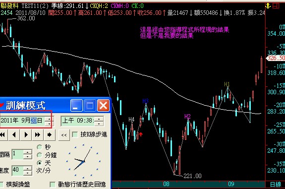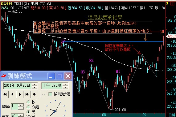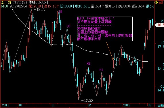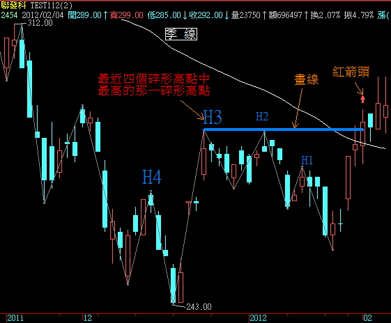 條件二: 收盤站上滿足條件一的四個碎形高點中最高的那一碎形高點,就做 (1) 就在該根k線標示向上的紅箭頭 並 畫線(畫線是由最高的碎形高點劃到該根k線) (2)標示此四個 碎形高點,寫上H1, H2, H3, H4