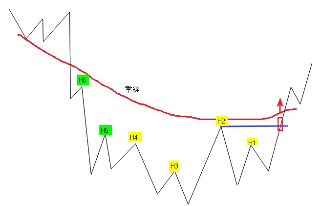 備註:若條件成立,即於圖上已畫上藍色水平線且已標示向上紅箭頭。則可發現圖上之紅箭頭,一定是在H1, H2, H3, H4的右邊