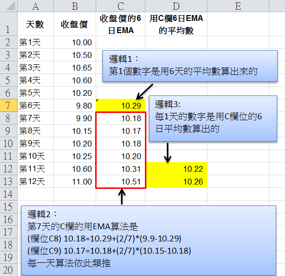 算式:例如欄位D12是用欄位C7~C12共6天的平均數,算法是10.22=(10.29+10.18+10.17+10.18+10.2+10.31)/6