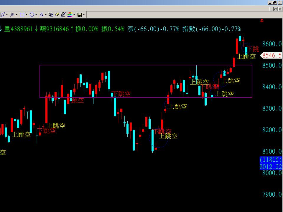 DRAWtext(l>ref(h,1) and DATATYPE=6 and islastbar, l,'上跳空');