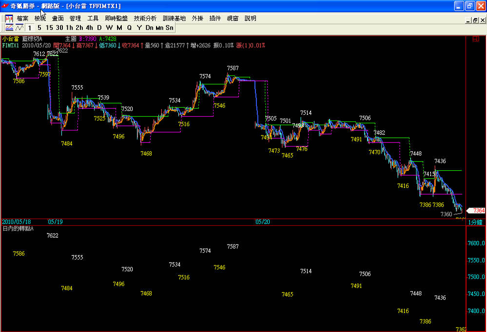 小弟已經把高低點的中點找出來了, 想要再請問總版主, 若換日後, 高低點要重算, 若開盤後指數往上走, 則開盤第一根的最低價為相對低點, 若指數往下走, 則開盤第一根的最高價為相對高點, 這樣程式該如何修改呢? 謝謝!