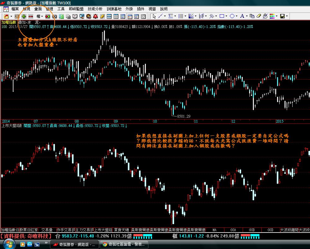 請問一下如果我想拿個股或指數跟大盤比較的話,主圖放大盤指數,副圖一定要利用自定公式的方式來做嗎?因為用主圖疊加的方式比較的話會和大盤k線重疊很不好看。