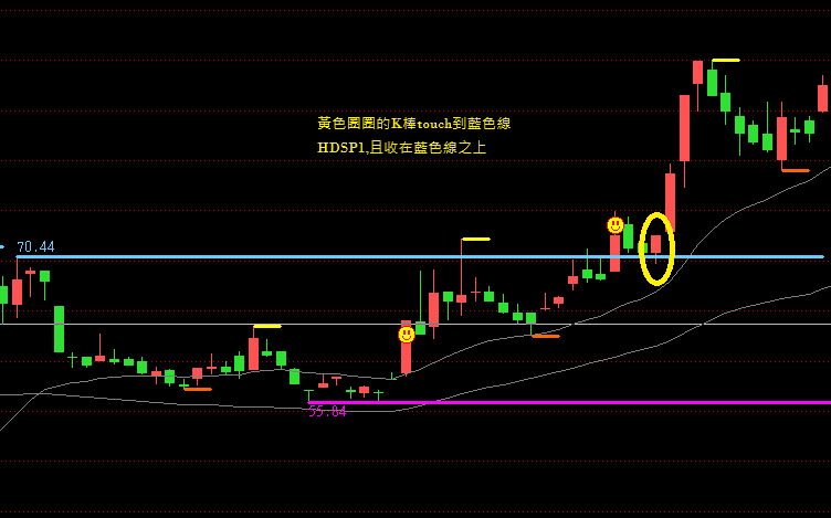請問如圖所示,黃色圈圈那個K棒,就是有touch藍色線(並不是上穿藍色線)且收在藍色線之上 求助語法,謝謝您
