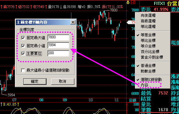 我試過取消"僅隨K線變動",也在系統選項\圖形OR座標分頁找過相關設定。請問該如何讓縱座標保持自訂的間距呢? 謝謝