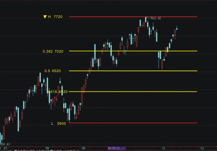3.在條件搜尋後可在主圖顯示高低點兩條紅線,並以黃線顯示0.618、0.5、0.382價位