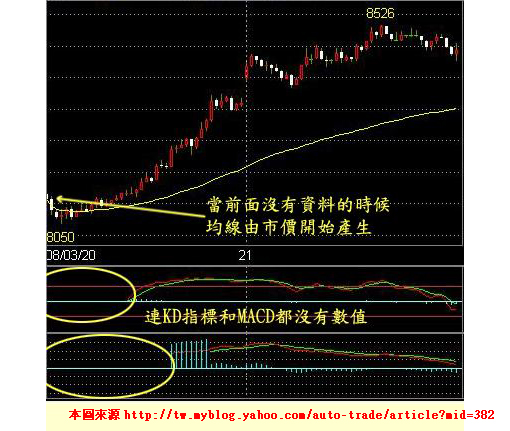 就好比2007.5.8以前沒有資料.所以均線開始以2007.5.8開始的第一跟K棒計算.