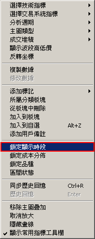 引用:最初由 hgt08161 發表 如題 (1) 先調整好K棒顯示您要鎖定的時段(例如12:10~13:10) (2) 對K線圖空白處點選滑鼠右鍵再選擇"鎖定顯示時段" (3) 直接點選確定