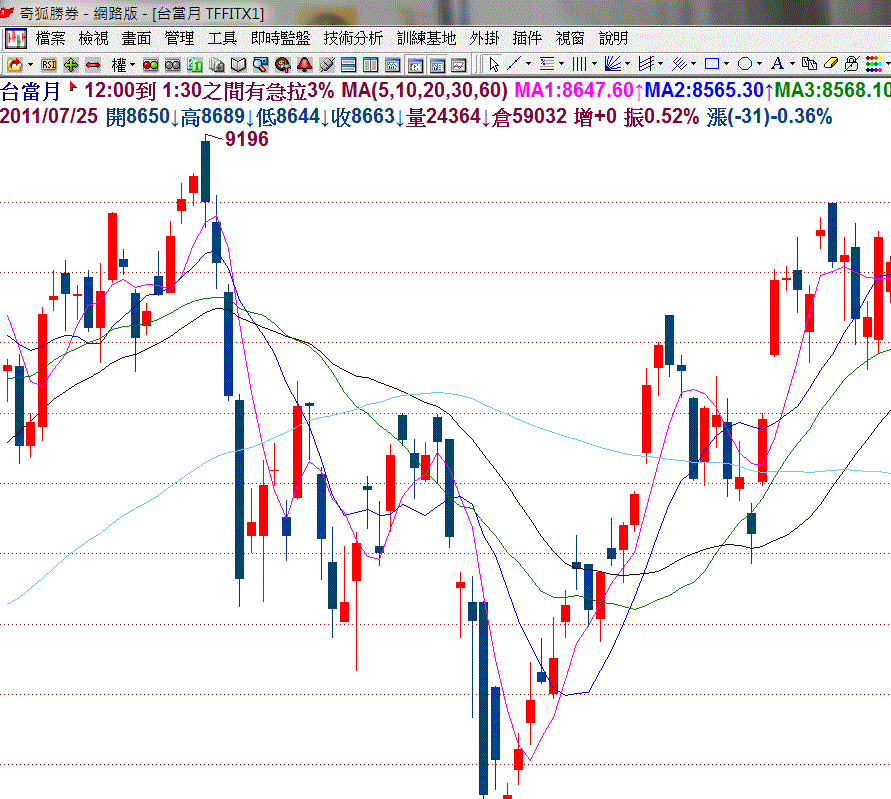 引用:最初由 cyberpeace 發表 請問為什麼 在任何時間周期的主圖上, 左上角第一行的股票名稱(例如台當月, 訊連...)後,會 先出現一個 小紅箭頭 , 緊接著出現 "12:00到1:30之間有急拉3%" 的字; 如何除去? 感激您! 沒見過有此功能唷 若換成 MA 指標就消失, 則應該是指標本身顯示的 若仍不會消失, 麻煩請把畫面的圖貼上