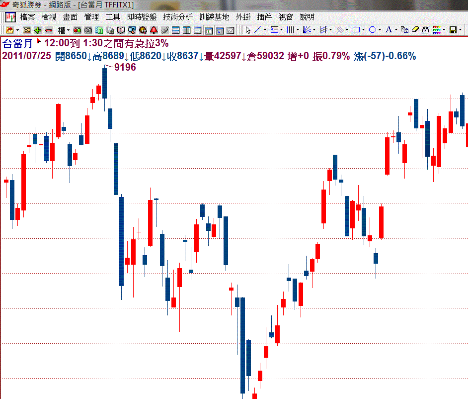 引用:最初由 cyberpeace 發表 總版主大人 不是指標本身顯示的, 只要是主圖,不管有無指標都會上角出現的 『紅色小箭頭 12:00到1:30之間有急拉3%』的字;