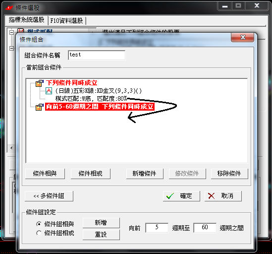 請問有無方法能將"模式匹配"之自繪型態與其他指標公式(ex: KD金叉)一起加入"組合條件"選股?謝謝