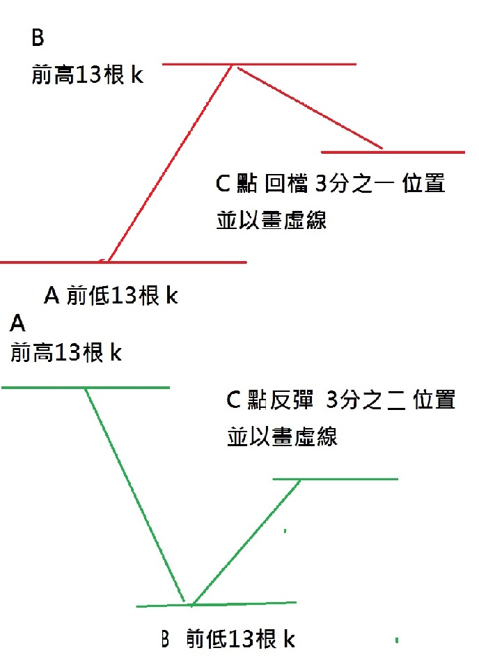 前波低點K線(13天)到前波最高點(13天) 回檔到3分一位置 且畫一條虛線 ..