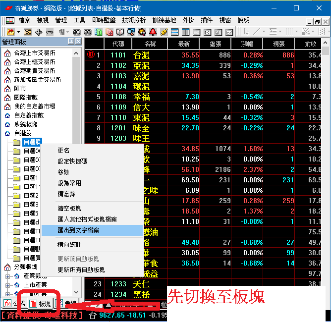 1.自選股匯出→點【管理】→點【公式板塊畫線管理】→左邊 管理面板先切換到【板塊】→打開 【自選股】