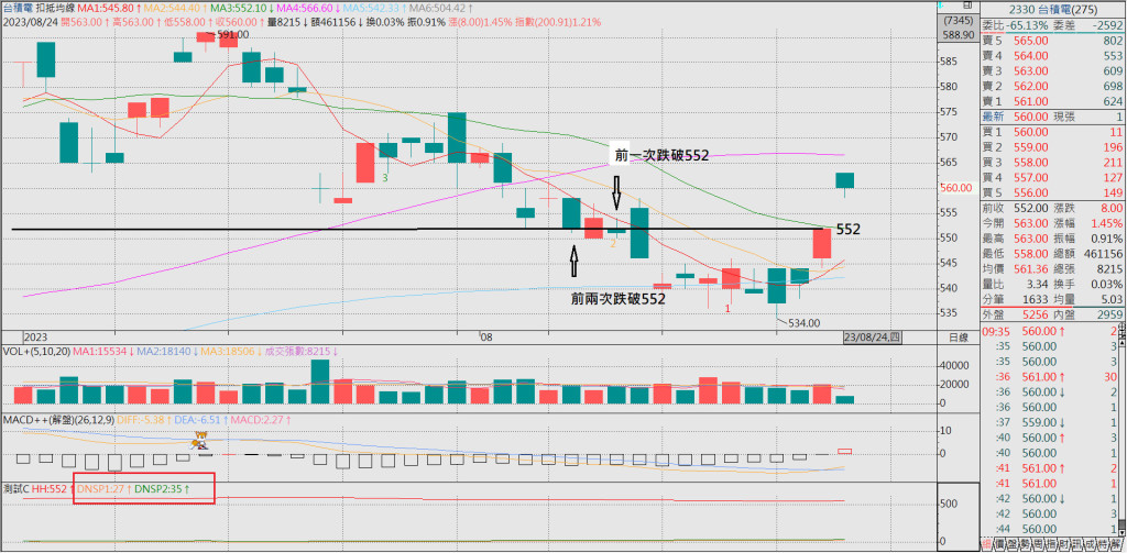台積電的前五日收盤價高點為552,前一次跌破位置與前兩次跌破位置為圖中箭頭處,可是程式顯示出DNSP1與DNSP2的位置卻不是箭頭處,好像是隨著五日收盤價的高點往前推而變動. 我試著把HH給定數552, HH:= 552.所產生的結果是正確.請問應該如何修正呢?