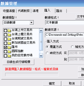 手中有好朋友提供的所有針對不同貨幣的單獨外匯數據 分別存在文字檔中 我用 管理\數據管理\匯入 結果卻匯入零個數據 請問 我如何才能將各品種的數據匯入