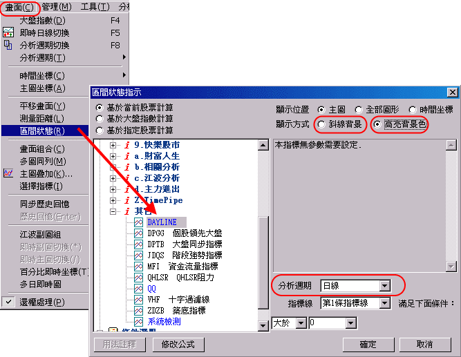 用[區間狀態] 於主圖背景標出加權指數 K>D 的區域