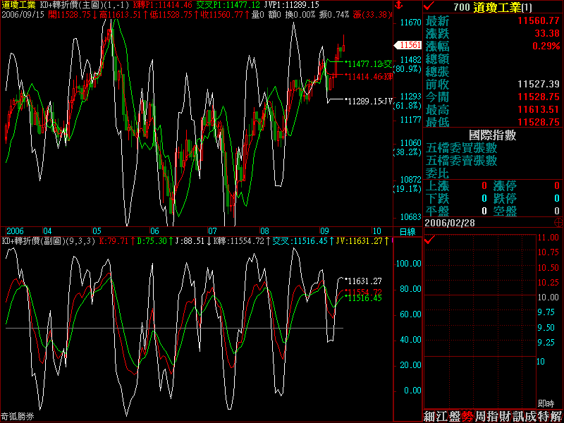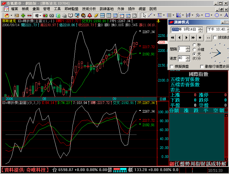 因為KD指標具有敏銳和高低檔鈍化的特質,所以我把它 以 "STKINDI" 拿來和K棒重疊用來觀察轉折,