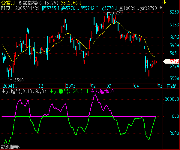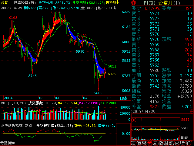 建議期貨以 M15/M30/M60 相互搭配來回作短線, (不建議作 ,M5,M10 太累啦) , D1作波段單, 我曾提過 "下週台股變盤在即", 因為大盤已跌啦近30天, 也該也該有個反彈, 可能幅度不大, 但個股表現就很不一樣, 還是會有漲的亂七八糟的跟跌的亂七八糟的. 個人認為 以04/21 @13:00, 大盤M30,M60都已站上短線轉折價. 5720一直沒有跌破. 台指逆價差曾高達60點是很不合理的. 一旦美指DJ站上 10268, 趨勢就會扭轉向上美/台股反彈就會開始, D1波段單就應見機進場. 2005/05/03 大盤多空在5850, 盤中低點估5804, 不破5804可續強. 否則回徹5720. 指數盤整時 容易被修理, 獲利也不高. 還不如等美台指都站上 D1 轉折點才作波段單.