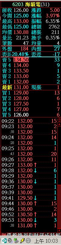 2.五檔報價的部份,真的是有點慢,以前就一直覺得怪,總是跟其他報價軟體不太一樣,這次終於有確實證據,因為我掛的130價位原來沒有,我於9:56掛出,其他報價軟體都沒幾秒就看到,奇狐到10:03都還沒有130,好像到10:05以後才出現,真的是太慢了,之前竹商銀爆漲的時候,我還有發現過盤後傳輸完畢都還跟別家的五檔報價數據不同,好像是少很多