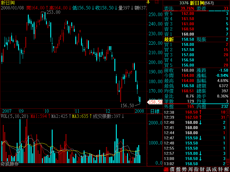 引用:最初由 shuenyi 發表 請問3376(新日興)的資料為何從12/28以後都補不進來呢?請問如何處理? 該股票已於2007/12/31由上櫃公司轉上市; 請選擇上市股票中的3376[新日興]即可, 舊有的上櫃股票中3376[新日興]則可以刪除掉。感謝您的發問!