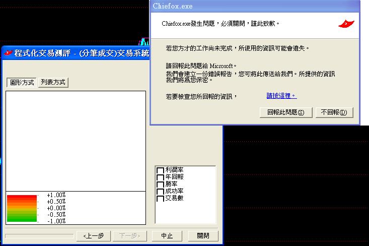 引用:最初由 soromance 發表 版主大大: 想要請教一下,當我在使用「分筆成交」在做數據分析時,不管是平常的分析或是計算最佳交易參數時,十次大概有八次會出現下面的訊息,然後程式是不正常的關閉,請問這是什麼原因呢?在使用一分鐘週期以上的線圖時就很少會發生這樣的事。是不是分筆成交在數據傳輸或是程式計算上有什麼需要注意的呢? PS:我每天都有使用「數據管理」紀錄分筆成交,而且每天都在用歷史回測功能。 請版大幫幫忙~~~ 謝謝.. 可能是公式沒有寫好造成的 您可能要檢查有無存取到無效數據或具無限迴圈的狀況