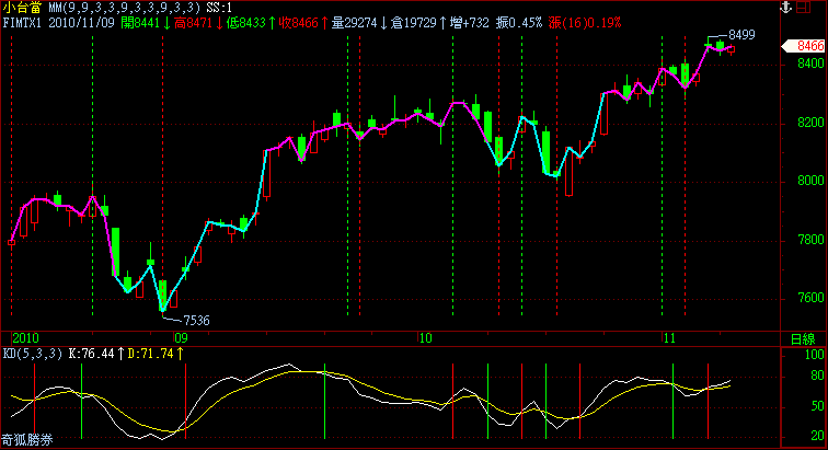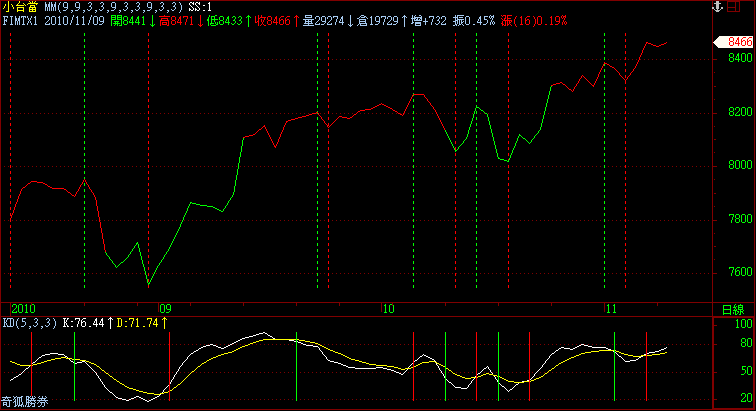 引用:最初由 yutinlai 發表 好,我就不要在禮多人奇怪了。 如果您有看我的圖的話你會發現,當KD還沒有交叉的時候 (不管黃交或死交),理論上,之前都會有一個攻擊點,如果是走多頭浪,就會有一個最近的多頭攻擊點,反之,如果是走空頭浪,就會有一個最近的空頭攻擊點。 問題就在於什麼時候會轉浪,也就是,收盤價確定突破會跌破原有方向的攻擊點,就轉浪了,原則上,每個當下都,只會有一個浪,也只會有一個方向的攻擊點。 因此,走多頭浪的時候,理論上,多方攻擊點是"越墊越高"。 是這樣嗎? 垂直紅虛線 多頭攻擊 垂直綠虛線 空頭攻擊 折線為浪