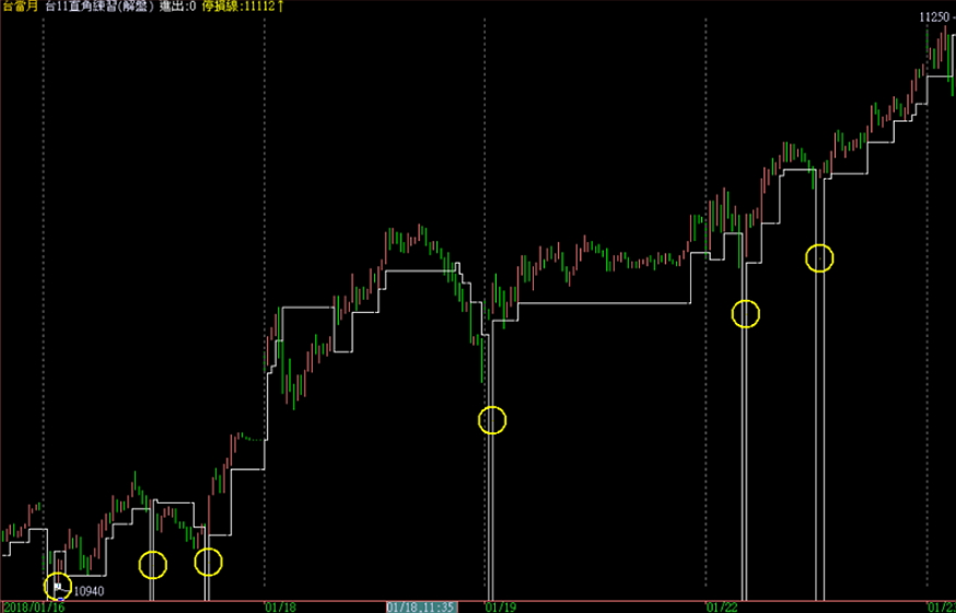 (3)若K棒有符合H>REF(H,1)and C>O條件,但取得的最低點低於目前往上的停損線,屬於不成立,停損線就維持用原來的.