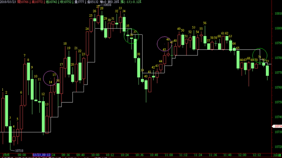 我附上圖試用今天期指3分線並將每根K線顯示編號說明初步想法如下:
