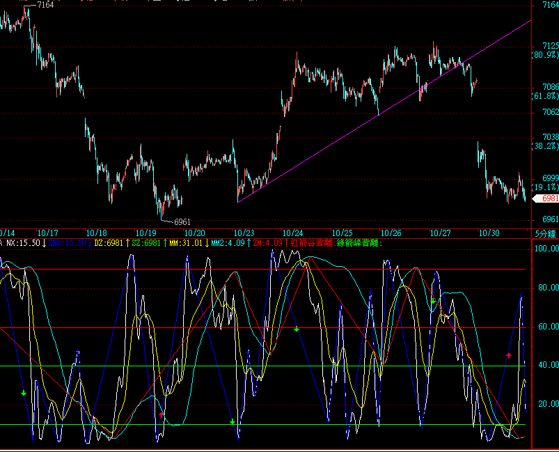 下圖副圖是背離指標 目前是五分週期 由於用zig做的 須有強大心臟才能使用 指標中已經說明相關位置