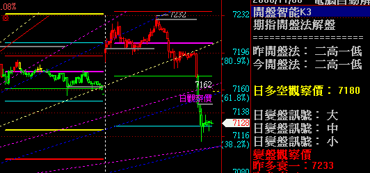 是偷懶吧 忙於目前要準備的內容 解盤使用半自動 當變盤訊號出來的時候 觀察是否當日以及次日是否有觸擊衰竭 做為轉折點 以今日為例 昨日出現變盤訊號 今日就觀察今日和昨日相關衰竭價 昨多衰竭一的位置在7233 早盤開高和昨盤後預期有些出入 然而 盤勢既然開高 就不用再想 剩下的只是何時價格會來到相關衰竭價位 加上一些畫線工具 似乎簡單多了 能力依然有限 機器又跑不太動 只好借助人工