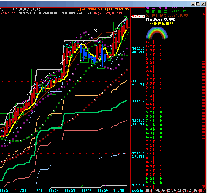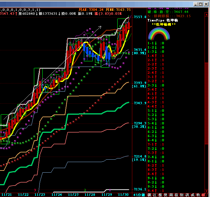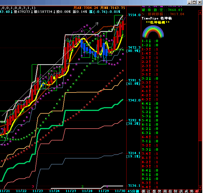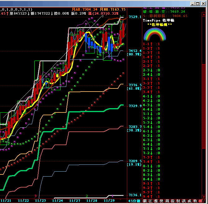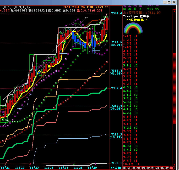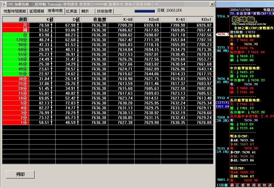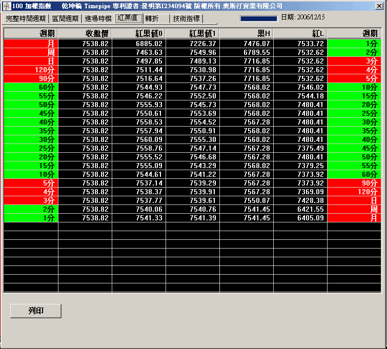 各色鑽石壓住地位置正是當時地時間 紅鑽-------12-------月 橙鑽--------五------週 黃鑽----------1------日 綠鑽----------11----時(為因應國際盤採24小時制) 藍鑽----------自訂周期(45分) 靛鑽----------自訂周期(25分) 紫鑽----------自訂周期(10分) 粉鑽----------自訂周期(03分) 自定週期依您喜好可自由訂定 盤面您只看到底層之大S與中心點之小S S------------畫分多空 大S--------代表市場 ----------|A ----------| ----------| ----------|D 小S------代表個人之心態 A-------D間還有無法劃出之好多S 希望如此說明看官能明白